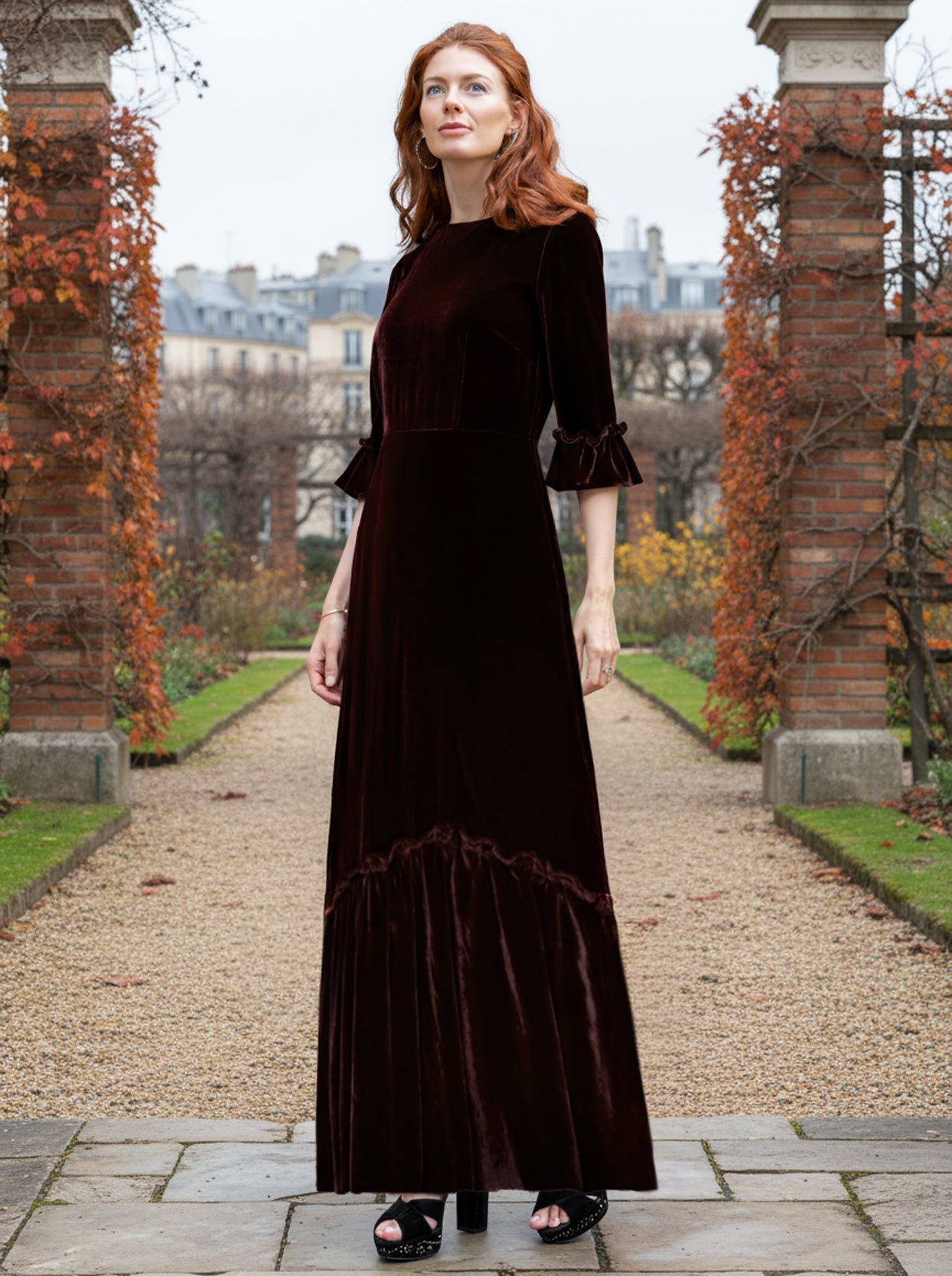 Our show stopping maxi dress is made with the finest silk velvet and features a round neck with puffed 3/4 length sleeves ending in a ruffled cuff, shoulder pads to emphasise the waist and give a pleasing hour glass shape and a fitted skirt with a frounced tier at the bottom. This dress is lined with a silk lining.