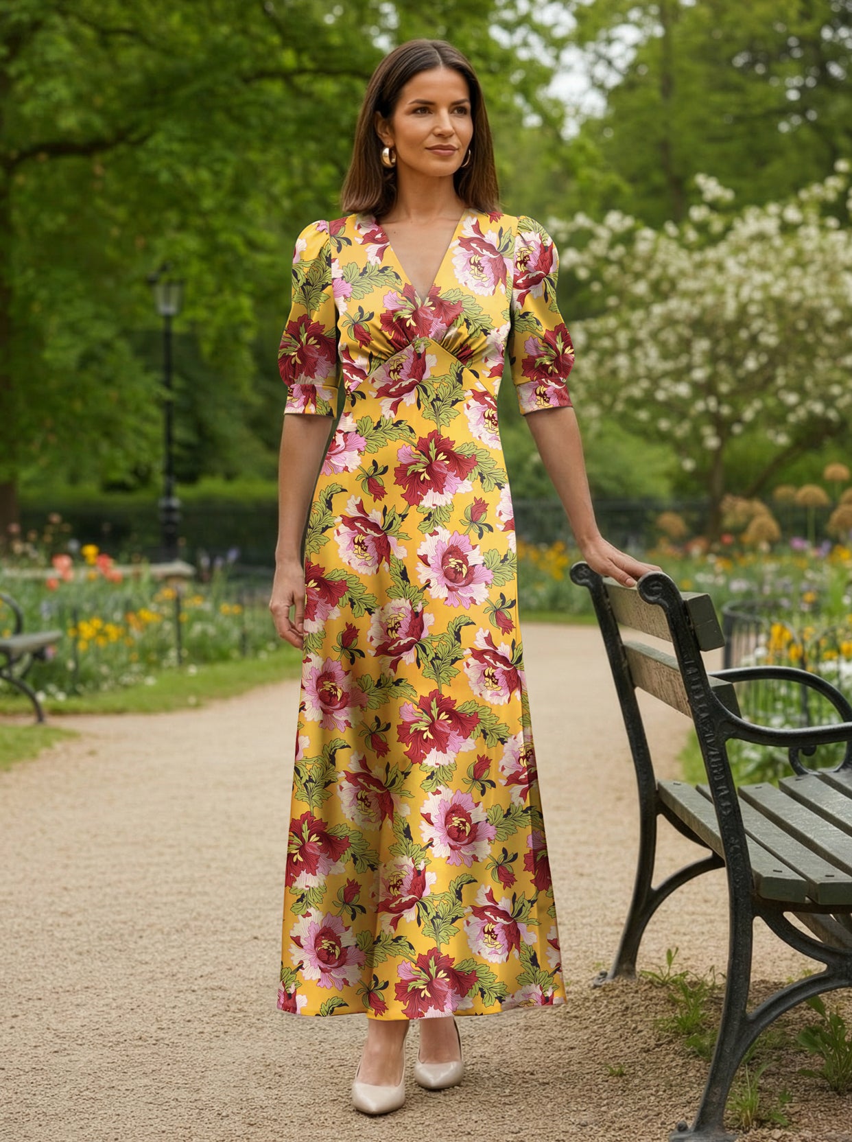 This show stopping maxi dress is made in one of our sumptuous Liberty print silk satins. It features puffed sleeves and a flattering v-neck, the bias cut skirt skims the body enhancing natural contours while remaining comfortable and effortlessly chic.