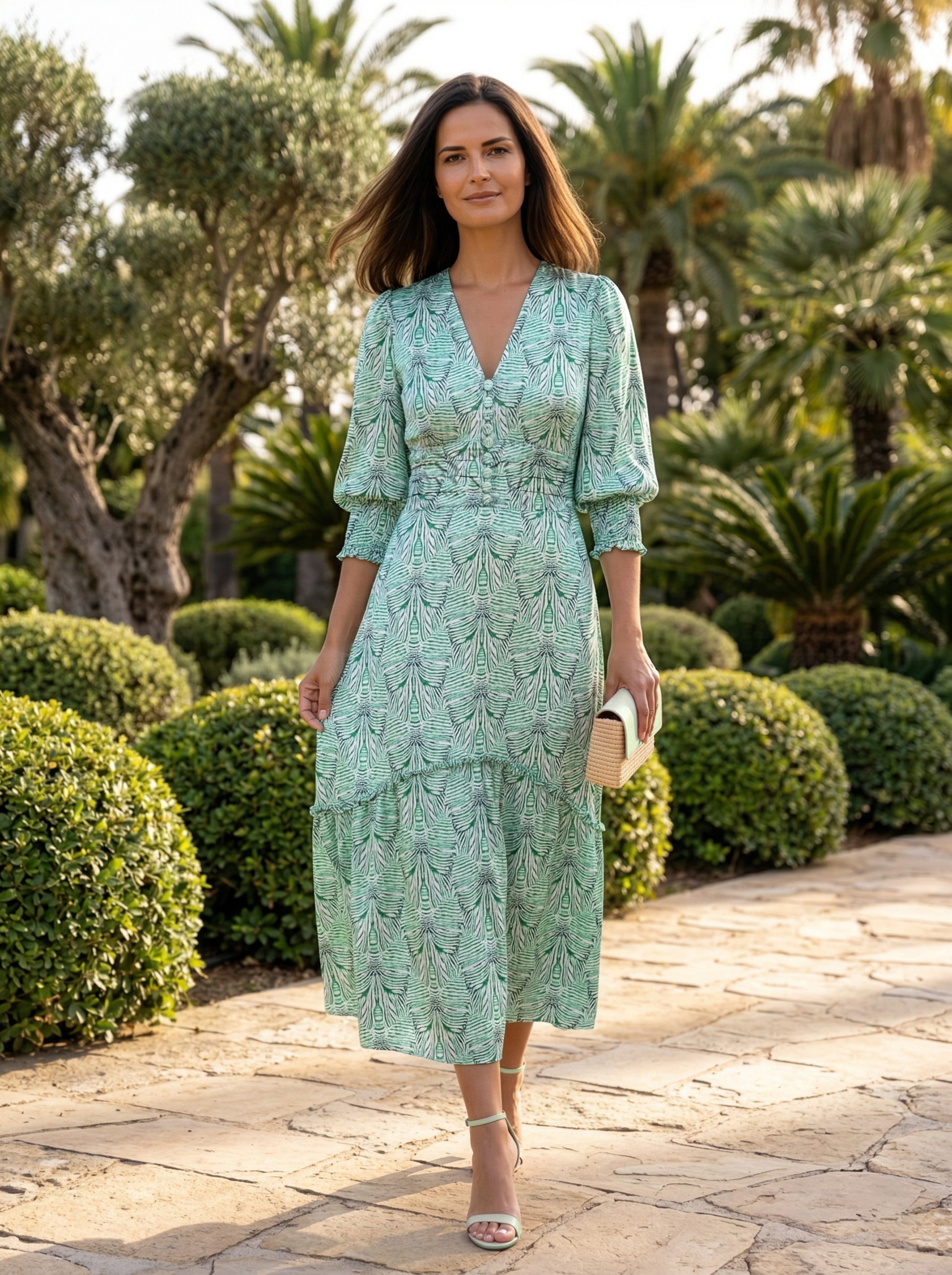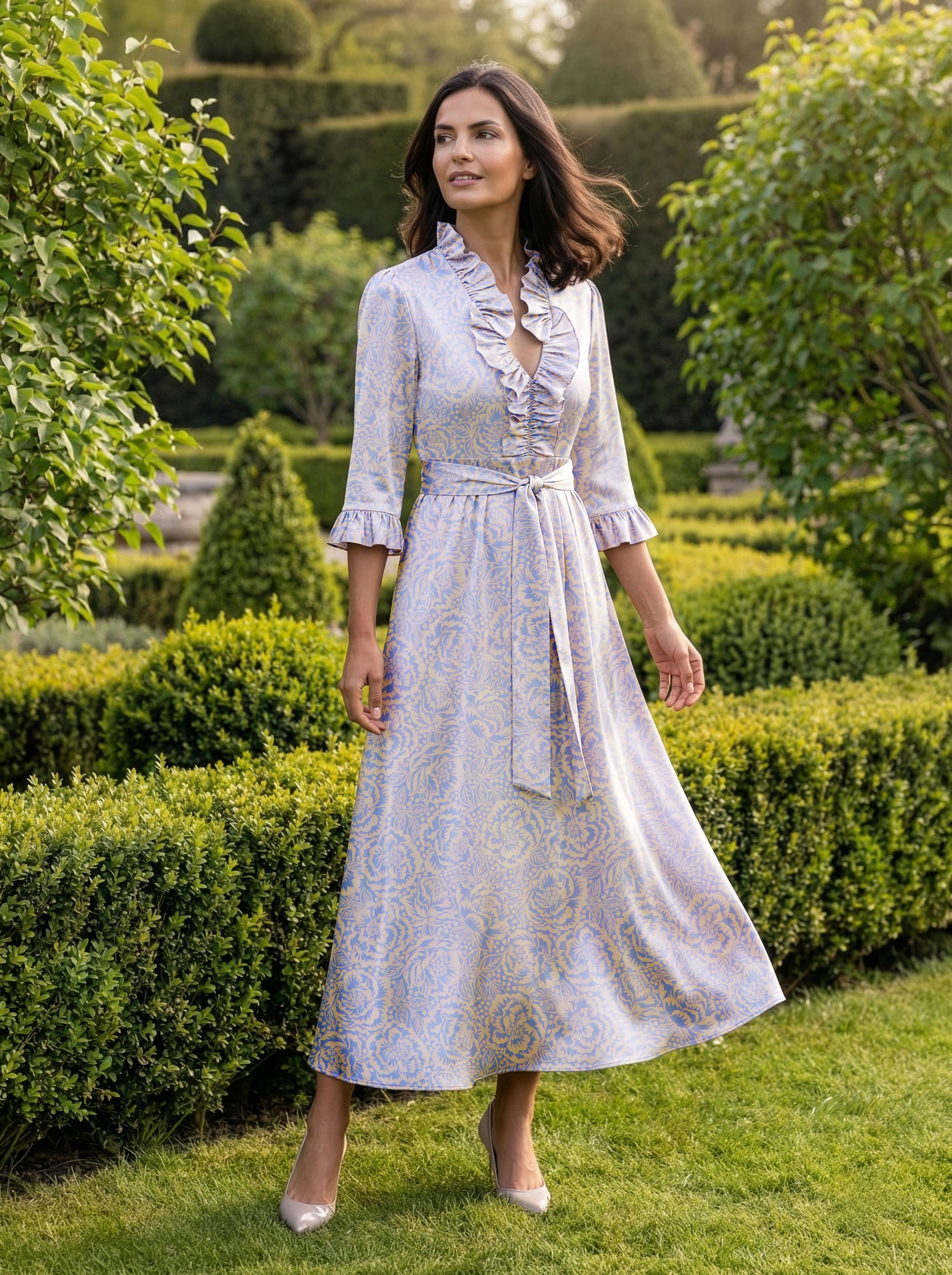 Our brand new style, the Ellen midaxi dress is made with the finest 100% twill and features a flattering v-neck with button down bodice with 3/4 length sleeves ending in a shirred cuff, shoulder pads to emphasise the waist and give a pleasing hour glass shape and a fitted skirt with 2 frounced tiers at the bottom.