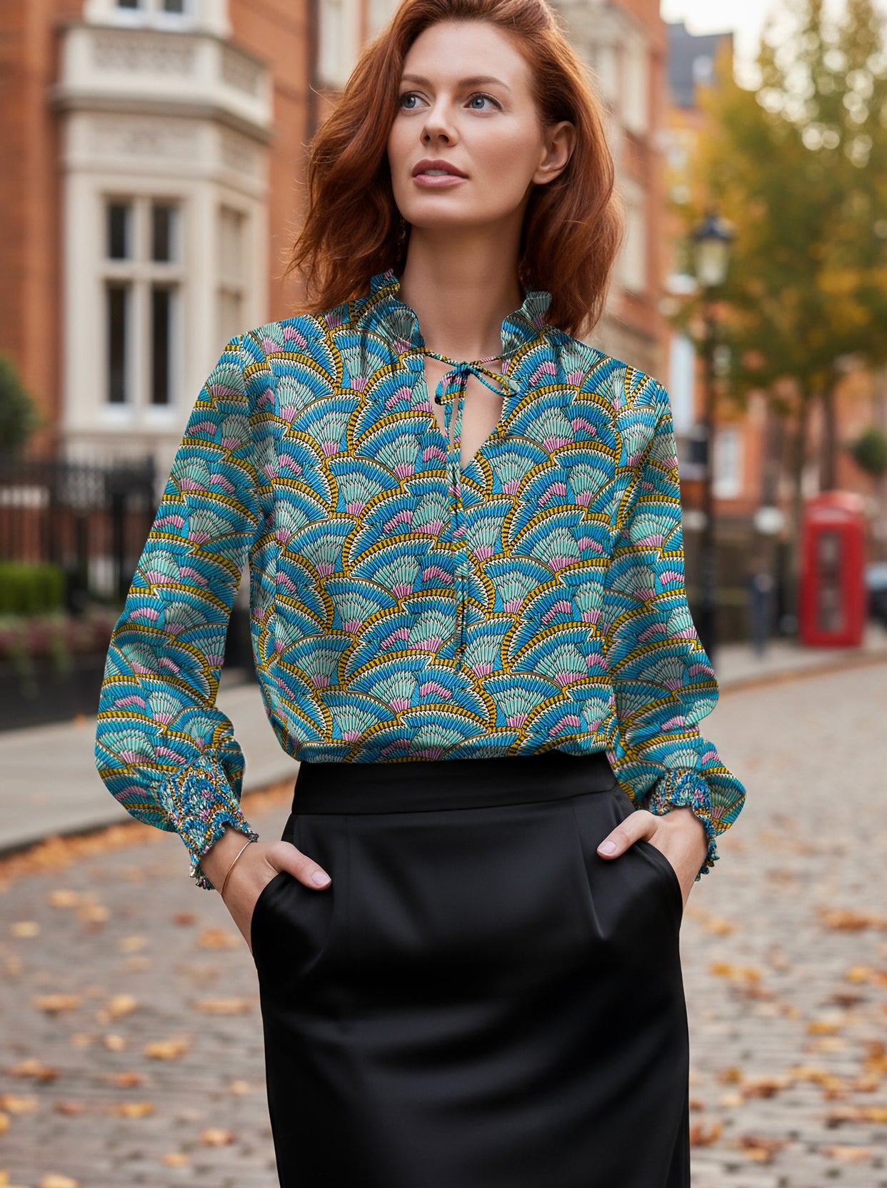 Flattering and bang on trend this pussy bow blouse looks great dressed up or down for on or off duty chic. Features include puffed sleeves finishing with a deep shirred cuff and a tie at the neck.
