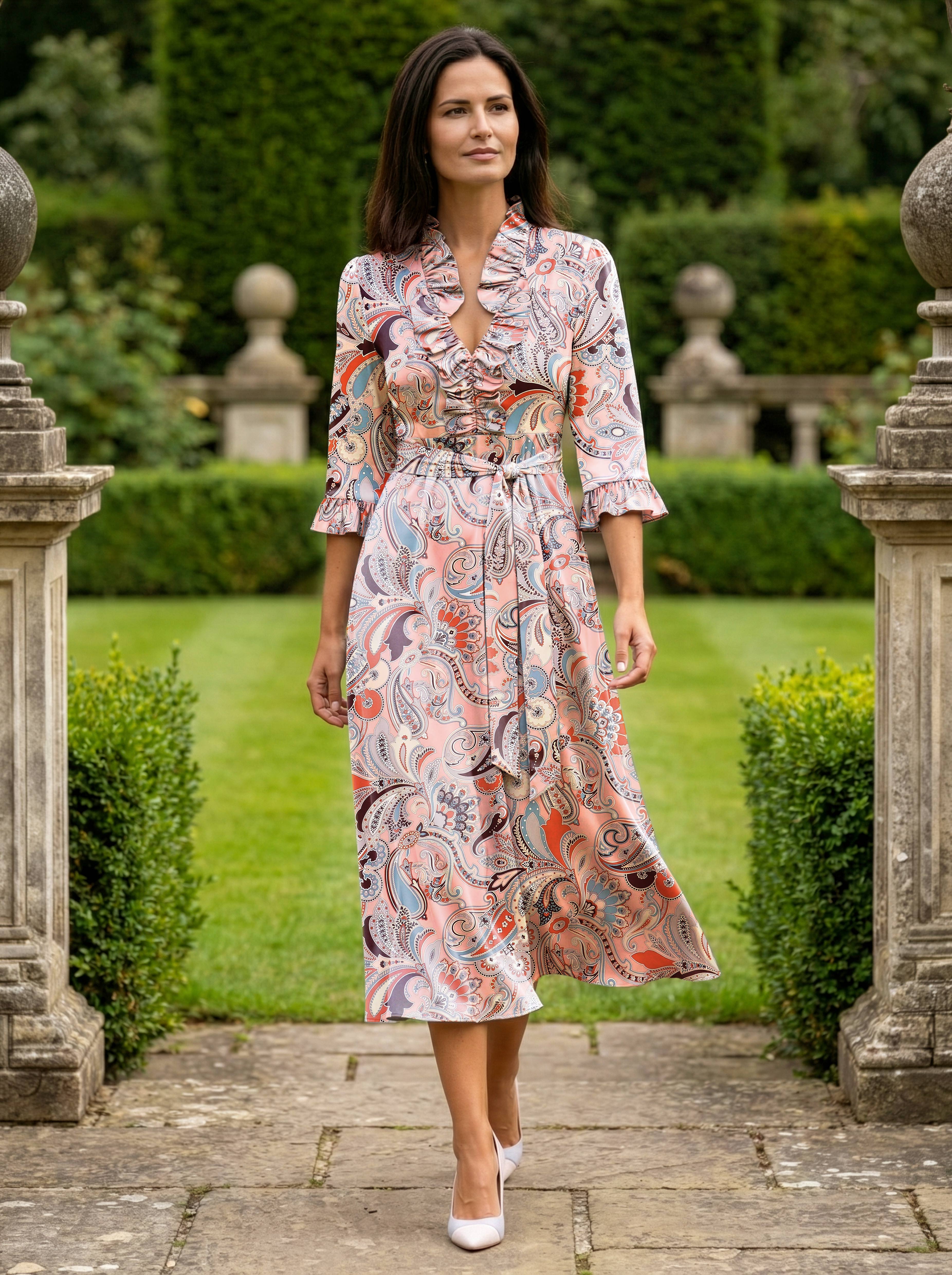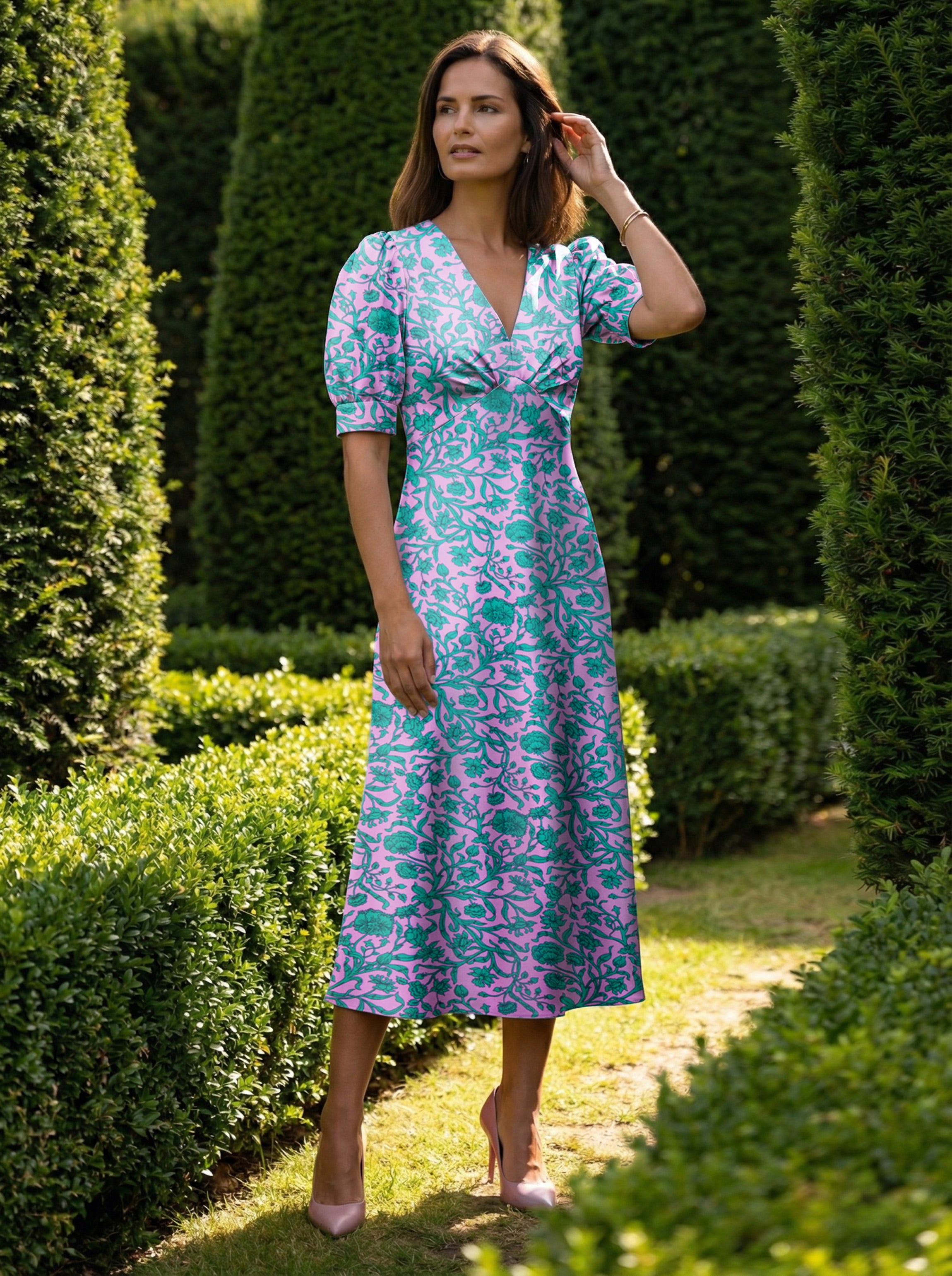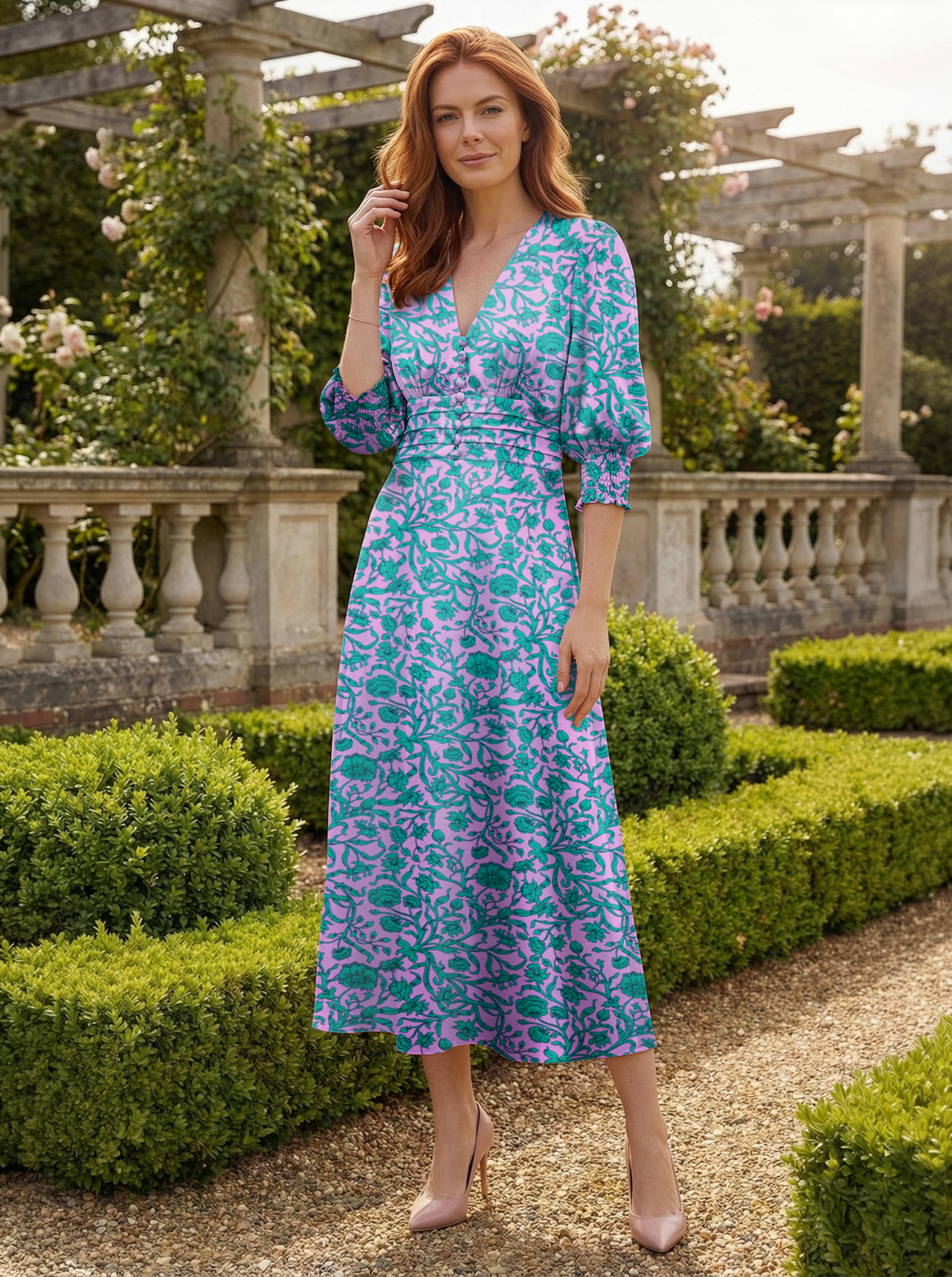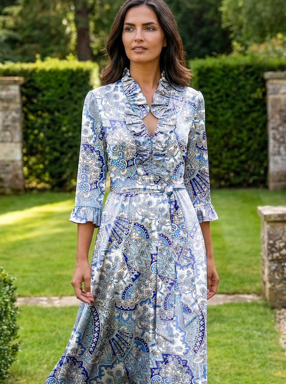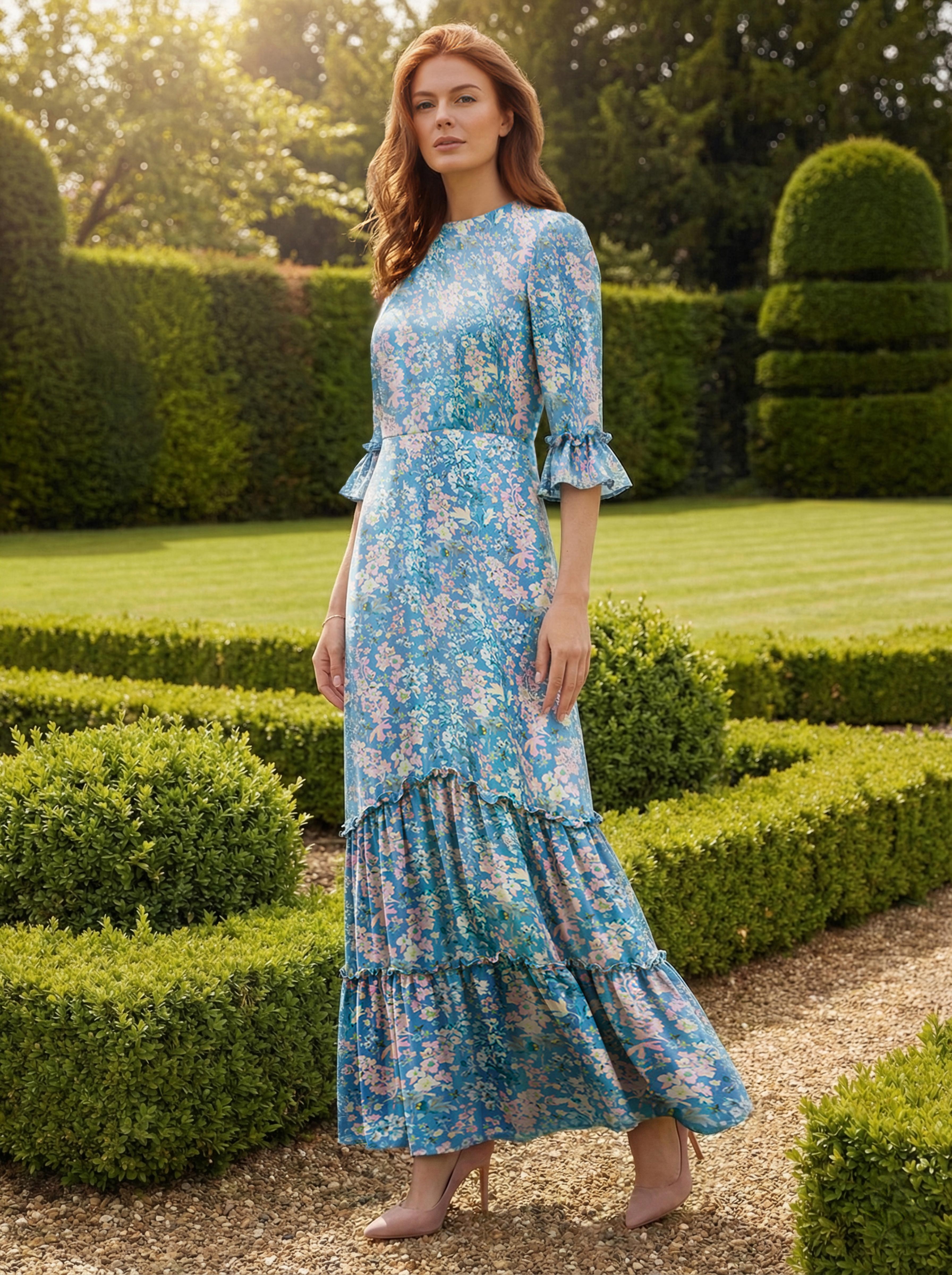 Our show stopping maxi dress is made with the finest Liberty print silk satin and features a round neck with puffed 3/4 length sleeves ending in a ruffled cuff, shoulder pads to emphasise the waist and give a pleasing hour glass shape and a fitted skirt with a frounced tier at the bottom. This dress is lined with a silk lining.
